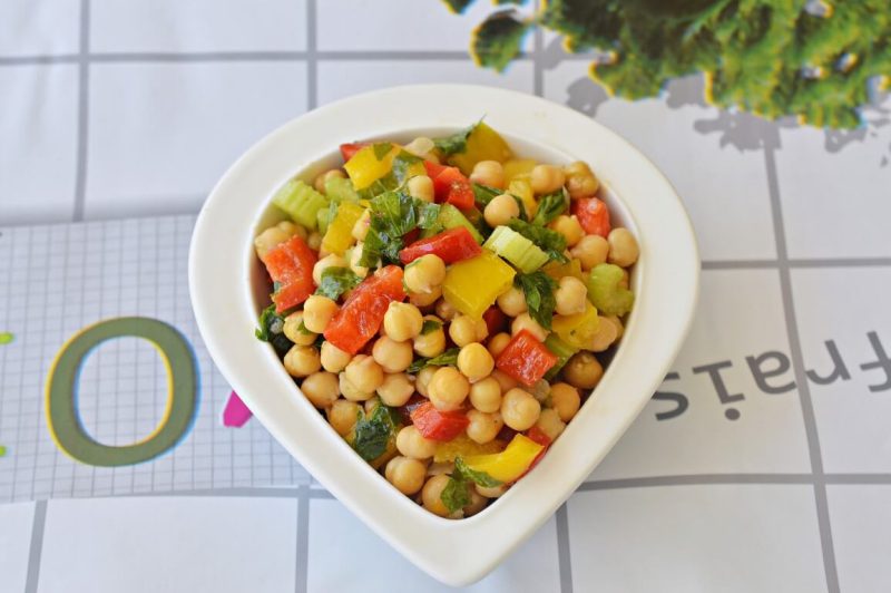 - מערבבים בקערה גרגירי חומוס, פלפל אדום, פלפל צהוב וסלרי ((עלים + גבעולים), יוצקים מעל את התיבול ומערבבים היטב.