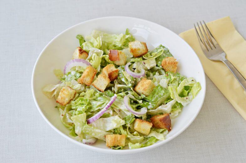 כף שמן זית, כף מיץ לימון, שן שום כתושה, כף מלאה מיונז, כף מים, כף מלאה גבינת פרמזן מפוררת, רבע כפית דבש, רבע כפית חרדל דיז’ון, מלח לפי הטעם (כרבע כפית), מעט פלפל שחור.איך מכינים סלט חסה עם קרוטונים?