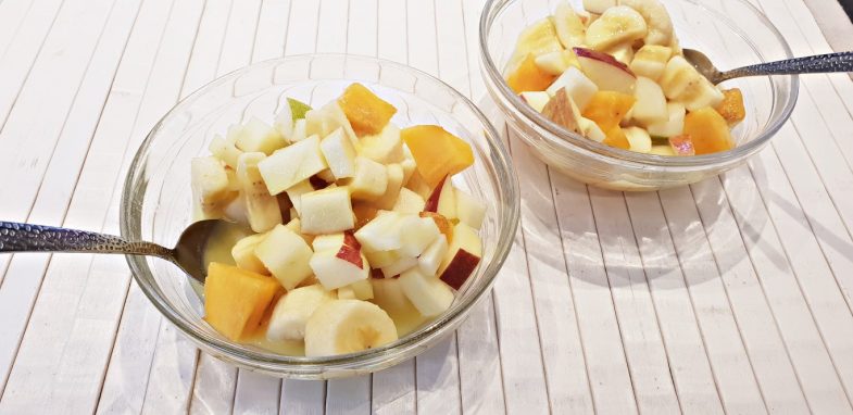 - פירות חתוכים לקוביות (כל מה שיש לכם במקרר): תפוז, קלמנטינה, בננה, תפוח, אגס, ענבים, אפרסמון, תות שדה, קיווי, מלון, פירות יער, אננס.