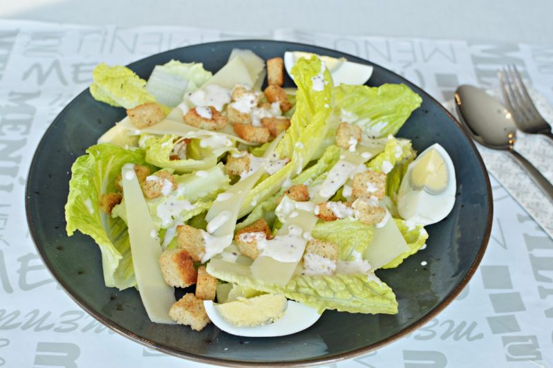 - מניחים את החסה בצלחת הגשה ומוסיפים את הרוטב. מוסיפים מעל גבינת הפרמזן, קרוטונים וביצה קשה חתוכה.