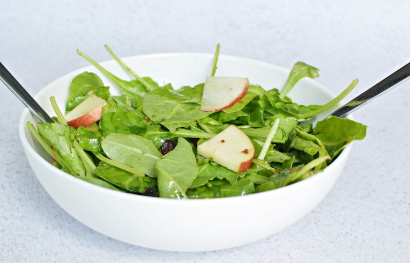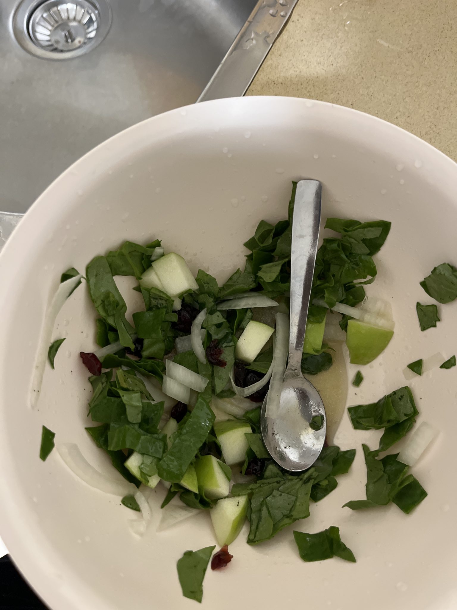- מניחים בקערה: עלי תרד, תפוח וחמוציות.