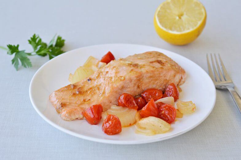 איך מכינים סלמון עם עגבניות שרי ובצל?