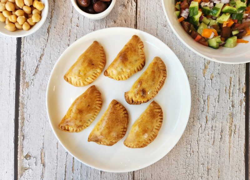 - מניחים את הבצק על נייר אפיה וקורצים עיגולים בעזרת כוס זכוכית הפוכה (קוטר כ-7 ס”מ). מניחים במרכז כל עיגול כפית מתערובת החומוס, מקפלים לחצי עיגול ומהדקים היטב בעזרת שיני המזלג.