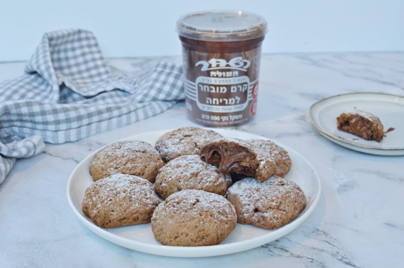 - בעזרת הידיים יוצרים מהבצק כדורים בעובי 2.5-3 ס”מ. מטמינים בכל כדור עיגול ממרח שהקפאנו ומכסים בבצק (מתקבלת עוגית שוקולד מבלי שרואים את המילוי).