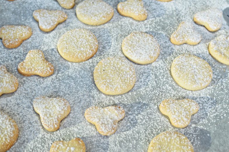 - מניחים את הבצק על נייר אפיה ומרדדים בעזרת מערוך לעובי של כחצי ס”מ. קורצים עוגיות קטנות בקוטר כ-4 ס”מ ומניחים בתבנית על נייר אפיה.