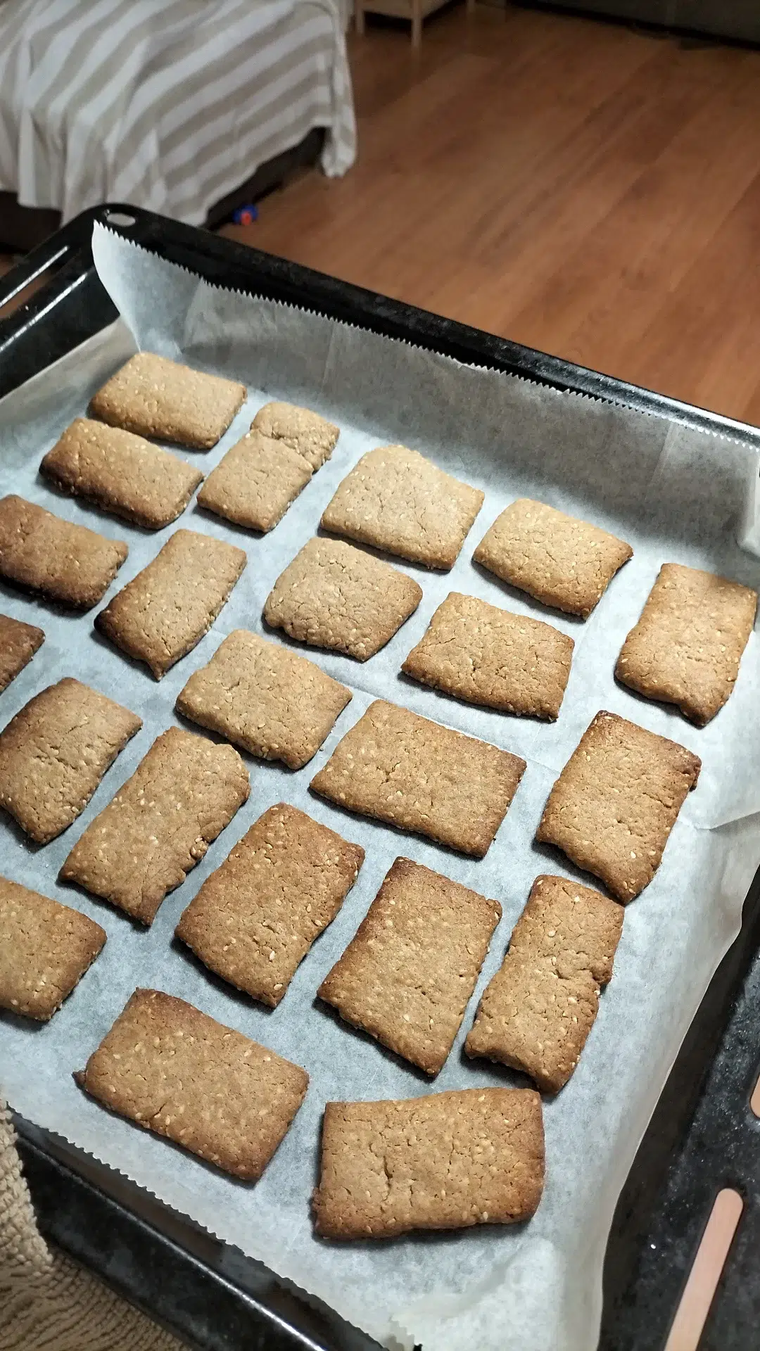 - מערבבים בקערה את הקמח עם אבקת האפיה. מוסיפים שומשום, סוכר לבן וסוכר וניל ומערבבים. מוסיפים ביצה, שמן ומערבבים. את המיץ מוסיפים בסוף, בהדרגה ולפי הצורך, עד שמתקבל בצק נוח לעבודה.