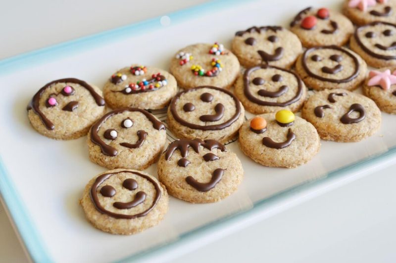 - פורשים נייר אפיה, מניחים את הבצק ומעליו פורשים נייר אפיה נוסף ועליו מרדדים בעזרת מערוך לעובי של חצי ס”מ. קורצים עוגיות בקוטר כ-5 ס”מ ומניחים בתבנית על נייר האפיה במרווחים קלים (ניתן לקרוץ בעזרת קורצן או כוס קטנה הפוכה).