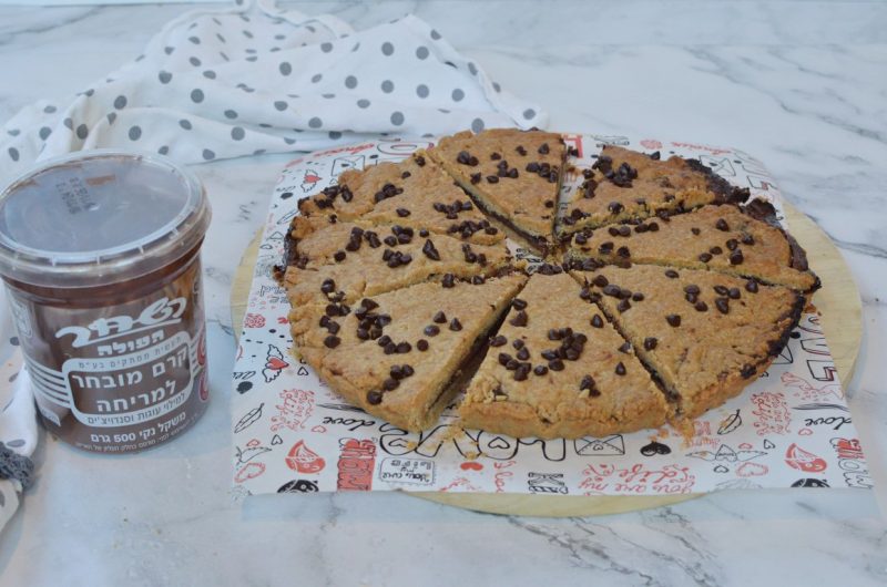 - משטחים חצי מכמות הבצק בתבנית, מעל מניחים את עיגול הממרח שהקפאנו ומעל מניחים את מחצית הבצק שנותר ומהדקים באופן אחיד. מפזרים מעל שוקולד צ’יפס ומהדקים לבצק. בעזרת סכין עושים סימון בחלק העליון של 8 משולשים.