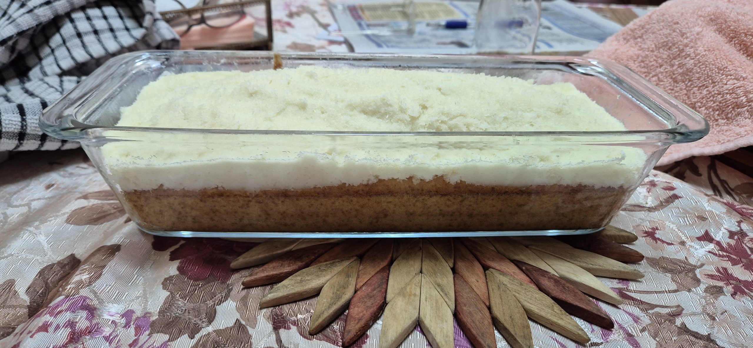 - מערבבים (בעזרת מטרפה ידנית או מיקסר) את הביצים עם הסוכר. מוסיפים שמן, חלב או מים, תמצית וניל ומערבבים. מוסיפים קמח תופח, פודינג וניל וקוקוס ומערבבים לתערובת אחידה.