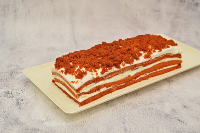 - חותכים ל-3 רצועות שוות ברוחב 10 ס”מ (את השוליים מסביב חותכים). מורחים מעל רצועת עוגה שליש מכמות הקרם ומניחים מעל רצועת עוגה נוספת שגם עליה מניחים שליש מכמות הקרם. מעל מניחים את הרצועה השלישית וגם מעליה מורחים קרם.