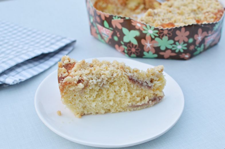 1. אני אופה את העוגה עד שהיא נהיית קצת פחות נוזלית ואז מורחת את הריבה ומפזרת פירורים