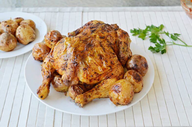 - מערבבים את כל חומרי הרוטב בקערית ומתבלים היטב את תפוחי האדמה והעוף (מורחים על העור וגם בחלקו הפנימי של העוף).
