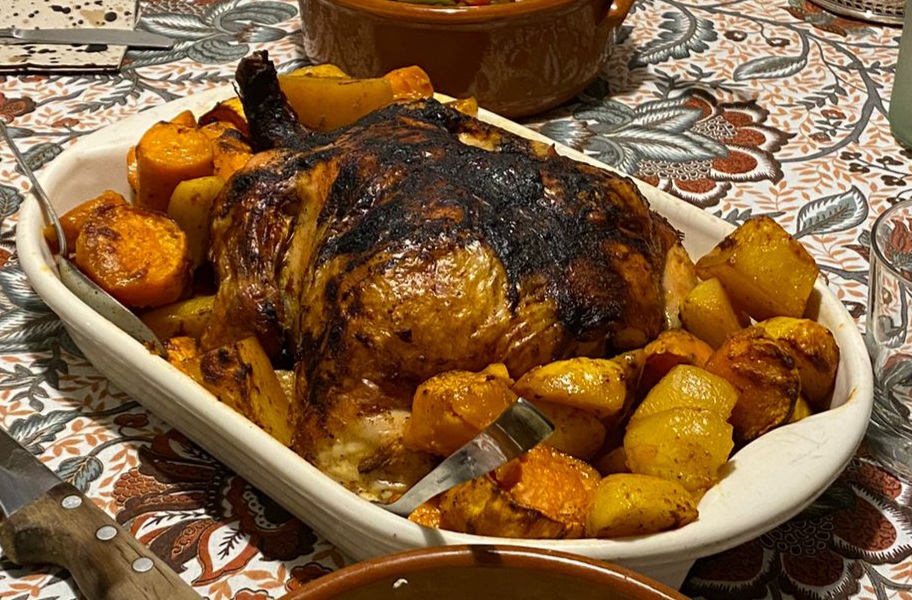 - מערבבים את כל חומרי הרוטב בקערית ומתבלים היטב את העוף השלם (מורחים את הרוטב על העור וגם בחלקו הפנימי של העוף) ואת הירקות (כולל ראש השום). מכניסים את ראש השום לחלקו הפנימי של העוף.