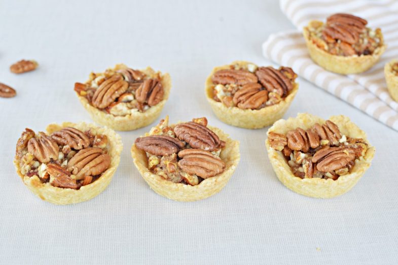 - -לאחר שהתחתיות מוכנות, מערבבים בקערה (בעזרת כף): חלבון ביצה, שמן, דבש ואגוזי פקאן קצוצים. מניחים כמות של כפית גדושה בכל “קערה” ומהדקים מעט. מניחים מעל 2-3 אגוזי פקאן שלמים ומהדקים.