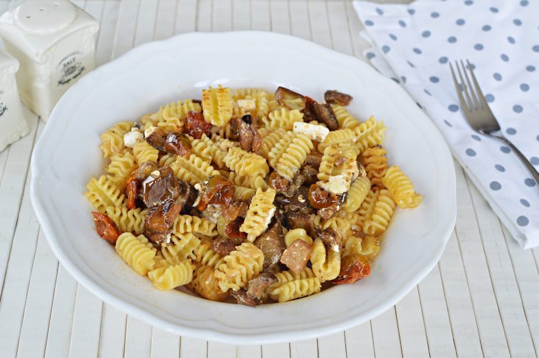 - מחממים מחבת רחבה עם כף שמן (אש בינונית) ומוסיפים את הפסטה המבושלת, החצילים והעגבניות. מוסיפים שן שום כתושה וקוביות גבינה בולגרית ומערבבים. מתבלים ב-2 כפות שמן זית, קמצוץ פלפל שחור ומלח לפי הטעם. מערבבים במשך כ-2 דקות ומסירים מהאש.