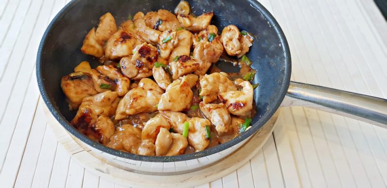 - מנגבים את המחבת משאריות נוזלים, מוסיפים כף שמן ומטגנים את פרוסות השום כדקה (אש בינונית - יש לוודא שהשום לא נשרף). מוסיפים למחבת רוטב סויה, צ’ילי מתוק ודבש ומערבבים במשך כדקה על אש בינונית-גבוהה. מוסיפים את הפרגיות ומערבבים היטב. מנמיכים לאש בינונית-נמוכה, מכסים את המחבת ומבשלים במשך כ-10 דקות, עד שהפרגיות מוכנות למאכל (יש לערבב מידי פעם). מוסיפים בצל ירוק, מערבבים כדקה נוספת ומסירים מהאש.