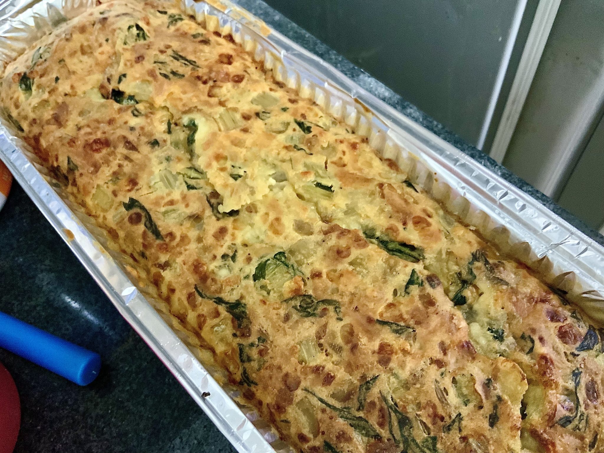 - לאחר שהתערובת מעט התקררה מעבירים לקערה. מוסיפים ביצים, קמח מעורבב עם אבקת אפיה, גבינת קוטג’, גבינה צהובה, מלח ופלפל שחור. מערבבים לתערובת אחידה.