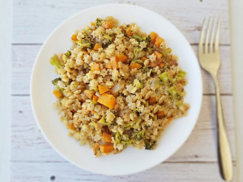 - מוסיפים את קוביות הגזר והברוקולי הקצוץ, ממליחים מעט ומבשלים עם מכסה במשך כ-10 דקות (יש לבשל על אש בינונית-נמוכה ולערבב מידי פעם).