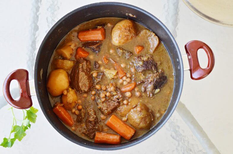 - 1-1.5 קילו קוביות בשר בקר בגודל בינוני (בקשו מהקצב כל בשר שמתאים לבישול ארוך: נתחים מס’ 2, 4, 6, 8, 9, 10)