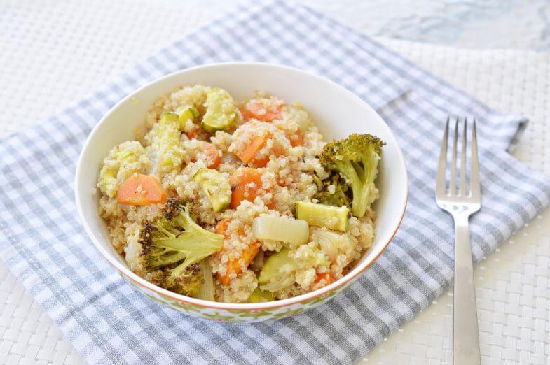 - מחזירים את הקינואה לסיר ומוסיפים את הירקות האפויים. מערבבים ומשפרים תיבול לפי הטעם (מלח ופלפל שחור).