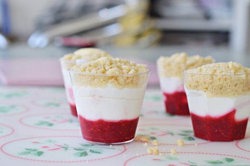 - עיצוב הכוסות: מניחים בתחתית כל כוס כף ממחית פירות היער. מעל מזלפים קרם גבינה (מומלץ להשתמש בשקית זילוף או שקית אוכל גזורה בקצה). מפזרים מעל פירורים.