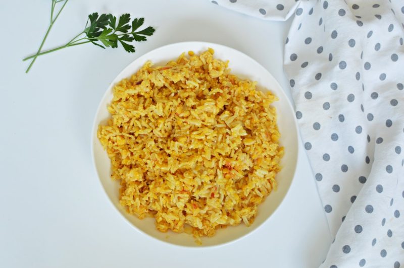 - מוסיפים אורז ועדשים אדומות ומתבלים ברסק עגבניות, כורכום, כמון, אבקת מרק, מלח ופלפל שחור. מערבבים כדקה.