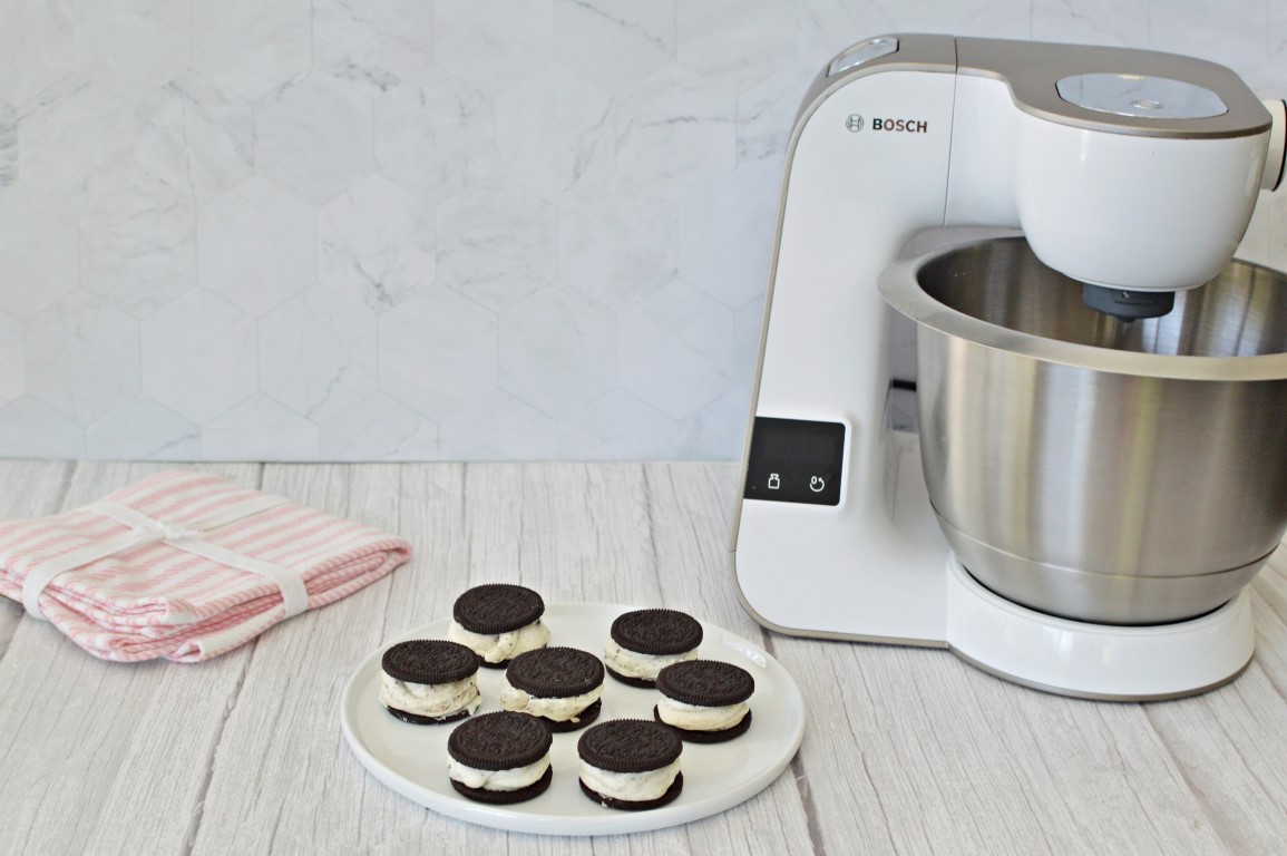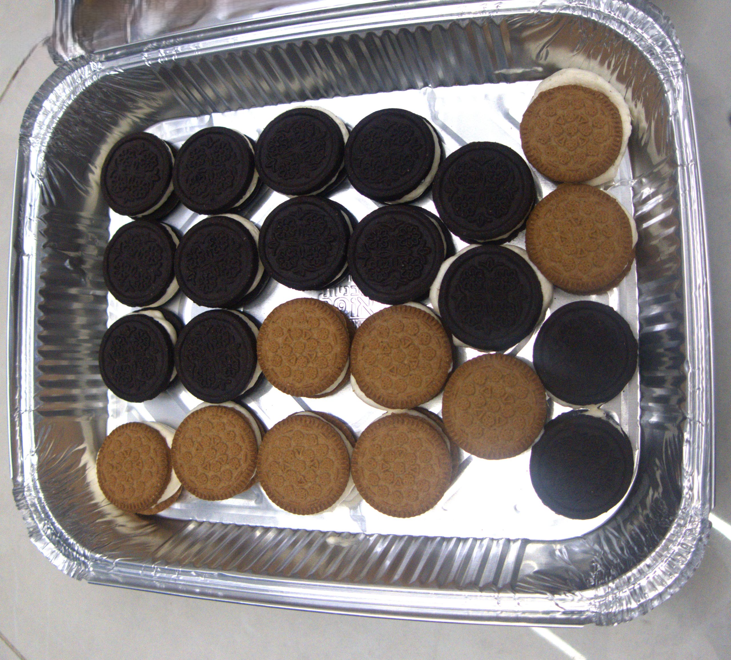 - מפרידים בין עוגיות אוראו. מעל כל עוגיה שמים מתערובת הקרם (בעזרת כפית או שקית זילוף) ומעל מניחים עוגיה נוספת (כמו סנדוויץ’).