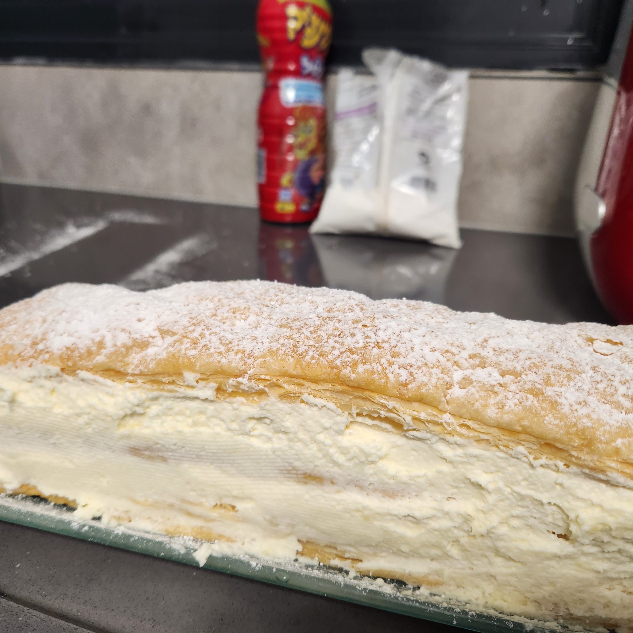 - מניחים על מגש עלה של בצק עלים אפוי. מעליו מורחים מחצית מכמות הקרם. מניחים מעל עלה נוסף ולוחצים מעט. מורחים את המחצית השנייה של הקרם וסוגרים מעל עם עלה נוסף. מפזרים מלמעלה אבקת סוכר.