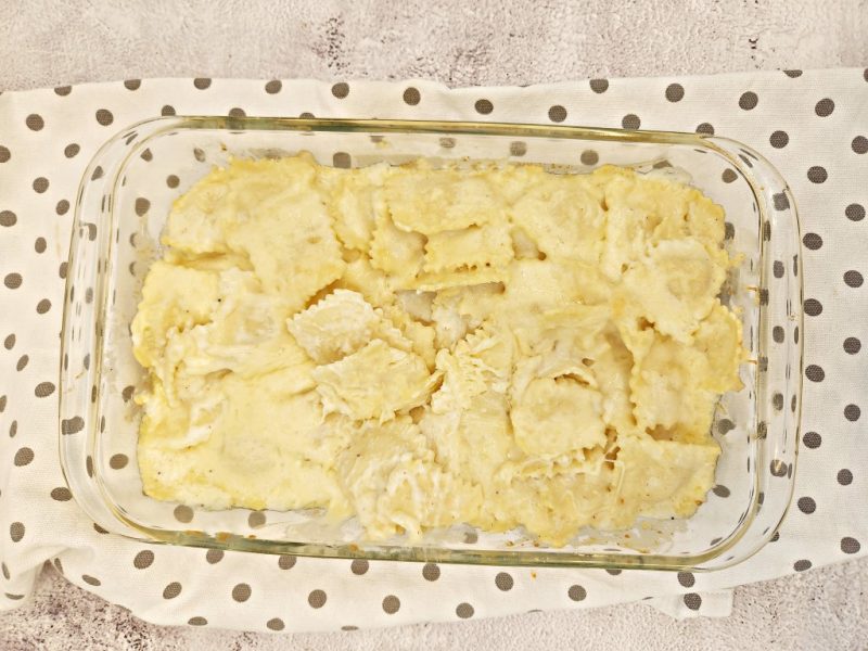 - שופכים מעל הרביולי את רוטב הבשמל, מערבבים מעט ומפזרים מעל גבינת מוצרלה ופרמז’ן.