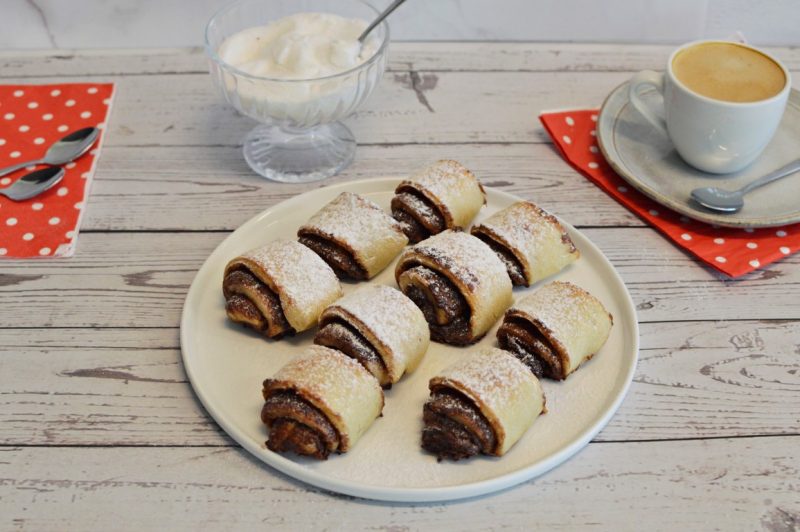 - מרדדים כל כדור למלבן דק-דק. מורחים על הבצק כ-2 כפות גדושות ממרח שוקולד. מגלגלים לרולדה ארוכה.