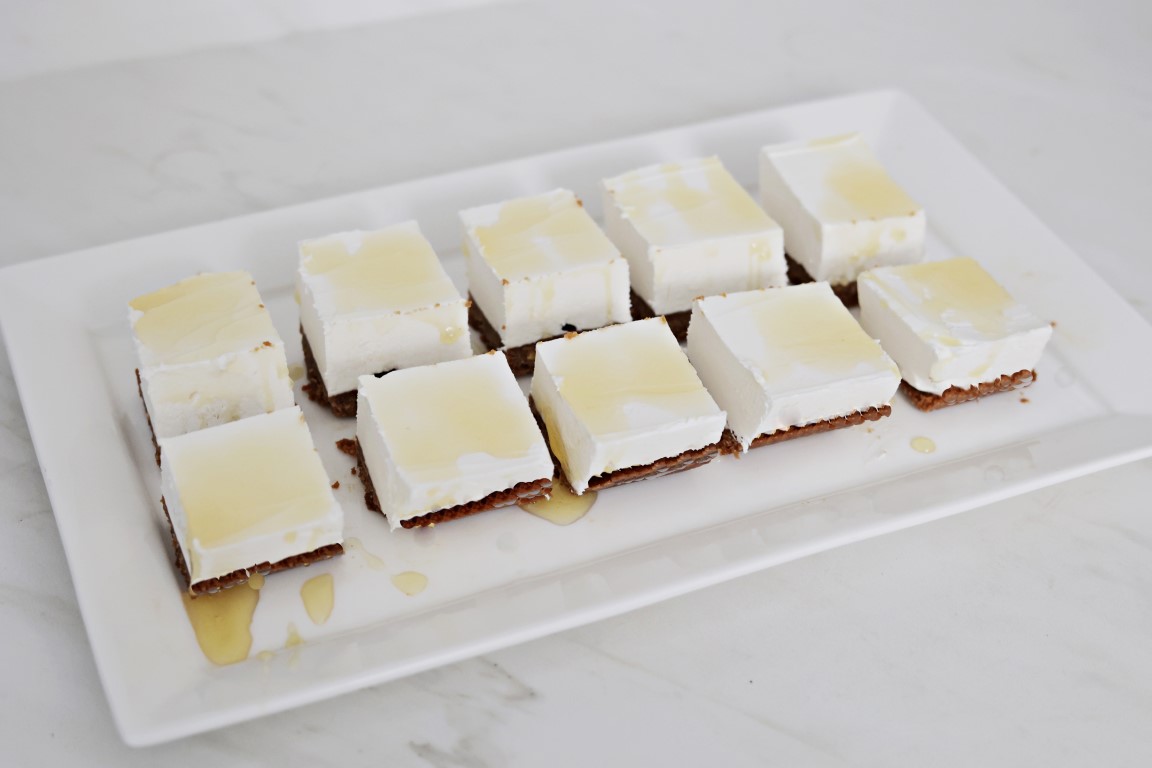 - מוציאים מהמקפיא, מחלצים מהתבנית וחתוכים לקוביות. מזלפים מעל דבש.