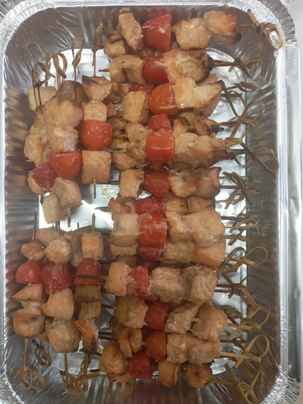 - מרפדים תבנית בנייר אפיה ומניחים עליה את שיפודי הסלמון.