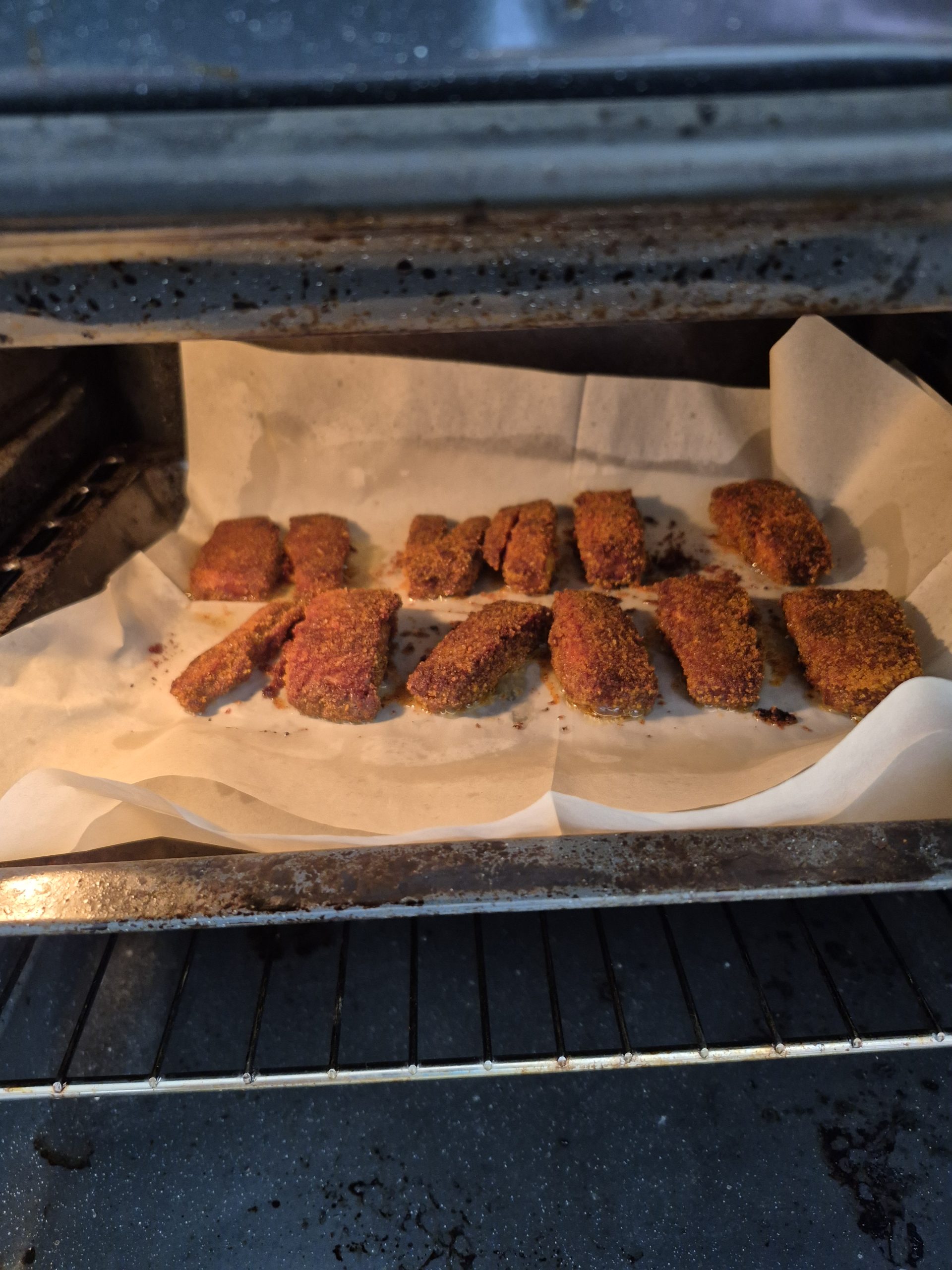 - משמנים בנדיבות נייר אפיה, מהדקים כל מלבן טופו בפירורי לחם משני הצדדים ומניחים על נייר האפיה.