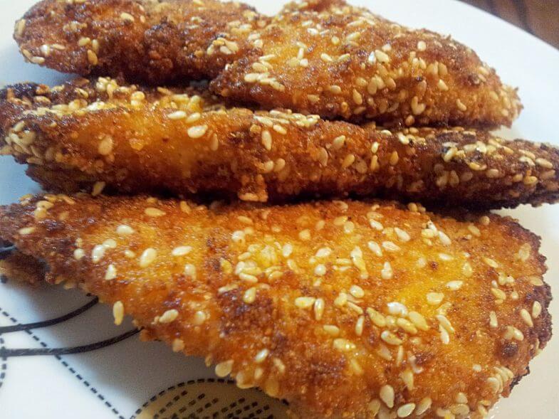 - מערבבים בצלחת פירורי לחם עם שומשום ומגלגלים את חזה העוף המתובל בתערובת עד לציפוי מלא.