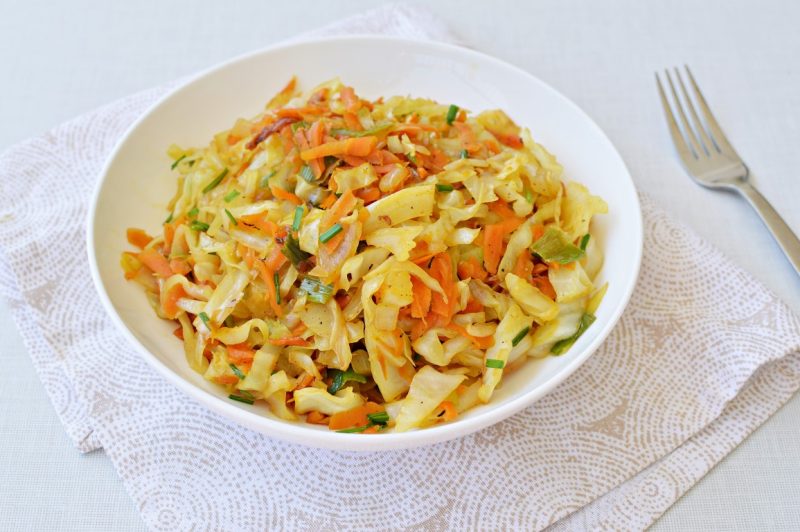 - מוסיפים את הכרוב הגזר, ממליחים ברבע כפית מלח ומבשלים על אש בינונית במשך כ-10 דקות עם מכסה, עד שהכרוב מאבד מנפחו והירקות מתרככים (יש לערבב מידי פעם).