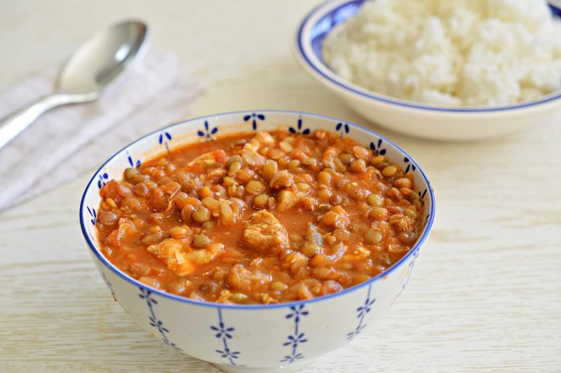 - מוסיפים את העדשים, שופכים מים רותחים ומתבלים ברסק עגבניות, פפריקה מתוקה, כמון, מלח ופלפל שחור. מערבבים היטב, מכסים את הסיר ומבשלים על אש נמוכה במשך כ-40 דקות (מידי פעם יש להרים את המכסה ולערבב).