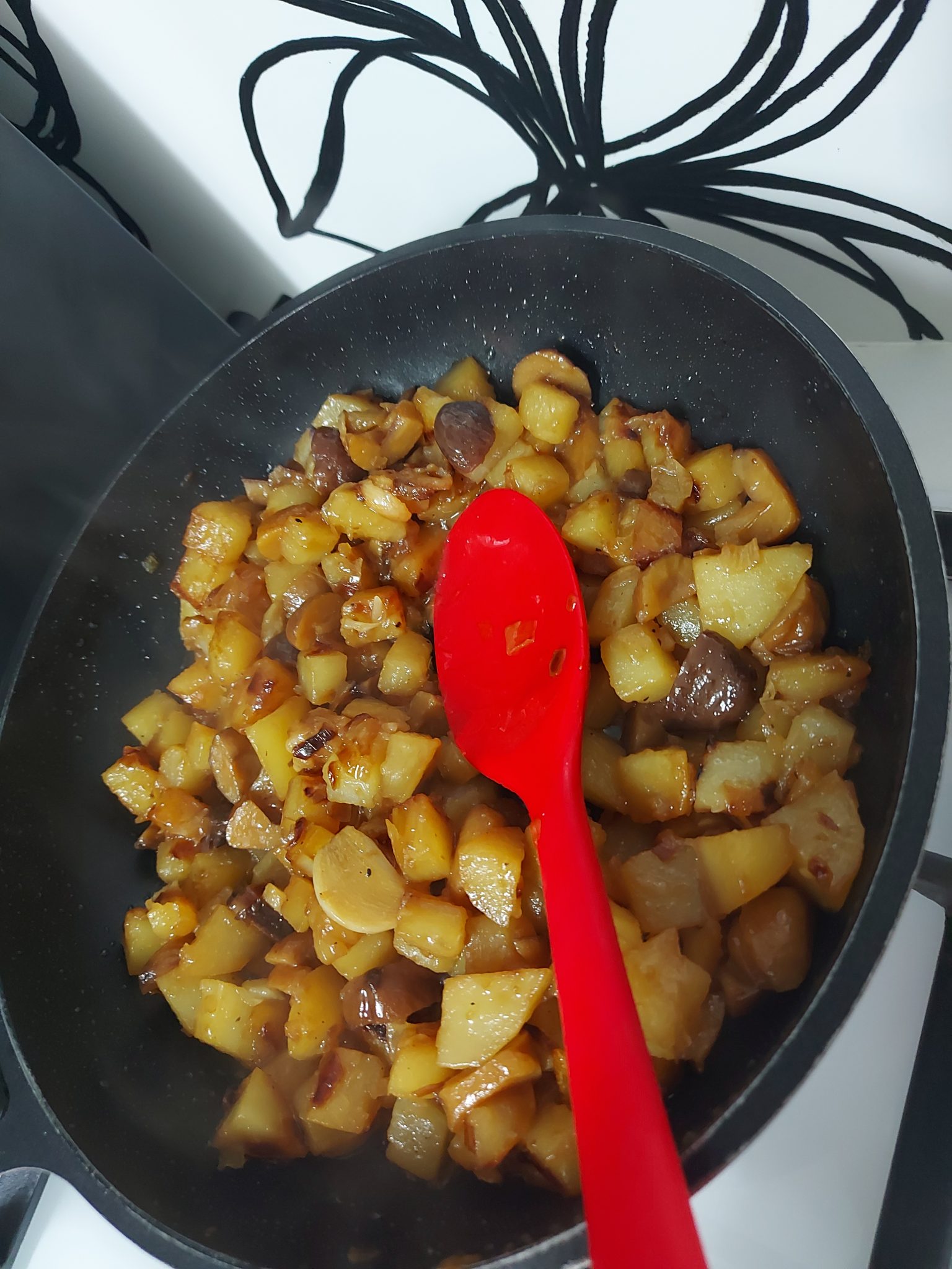 - חותכים את הערמונים גס ומוסיפים למחבת. מתבלים במלח, סילאן ופלפל שחור. מוסיפים שליש כוס מים רותחים, מערבבים, מכסים ומבשלים במשך 10 דקות נוספות, עד שתפוחי האדמה מתרככים.