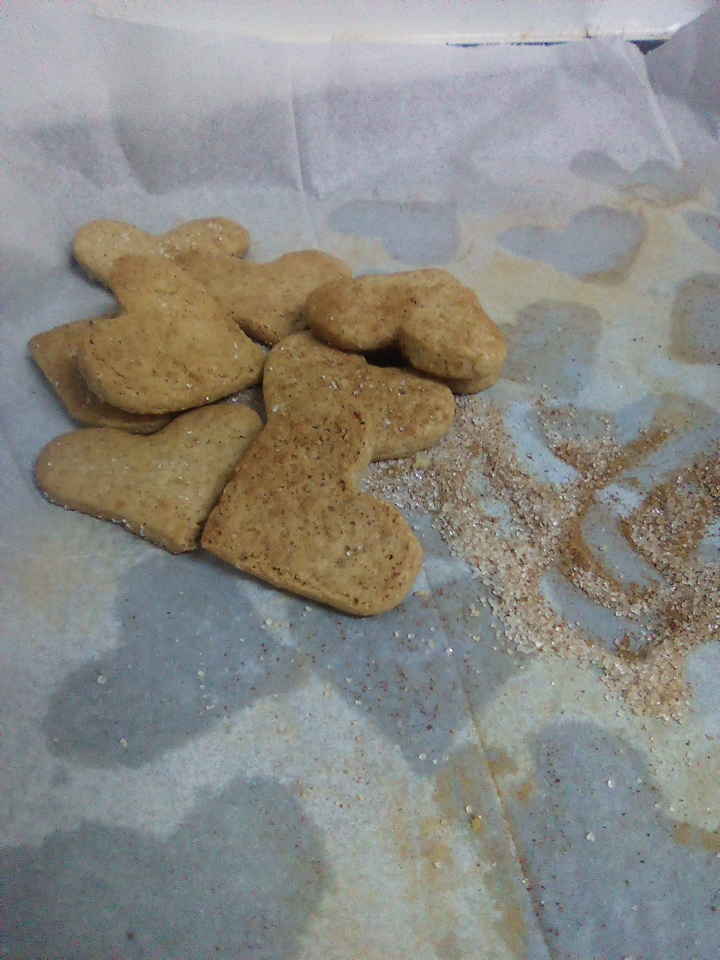 - מקמחים היטב משטח עבודה ובעזרת מערוך מקומח מרדדים את הבצק. קורצים צורות ומסדרים על נייר אפייה. מפזרים מעל קינמון וסוכר (ראו חומרים ‘לקישוט’).